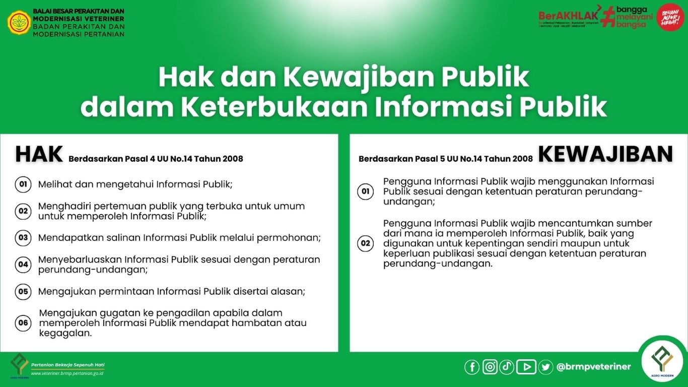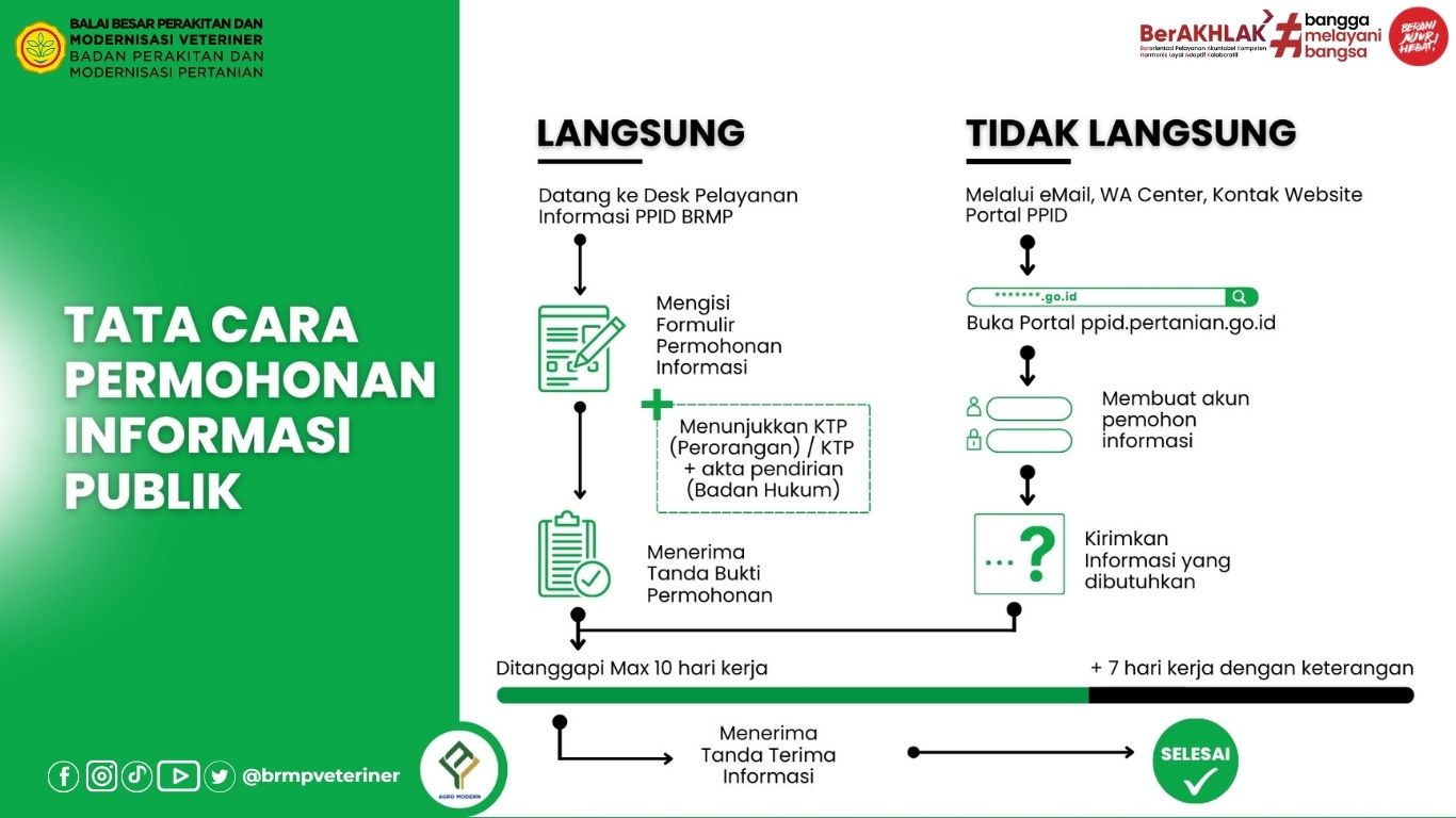 Prosedur Pelayanan Informasi Publik lingkup Balai Besar Perakitan dan Modernisasi Veteriner (BRMP Veteriner) disusun berdasarkan Peraturan Menteri Pertanian Nomor 32/Permentan/OT.140/5/2011 tentang Pengelolaan dan Pelayanan Informasi Publik di Lingkungan Kementerian Pertanian dan Peraturan Komisi Informasi Republik Indonesia Nomor 1 Tahun 2021 tentang Standar Layanan Informasi Publik.